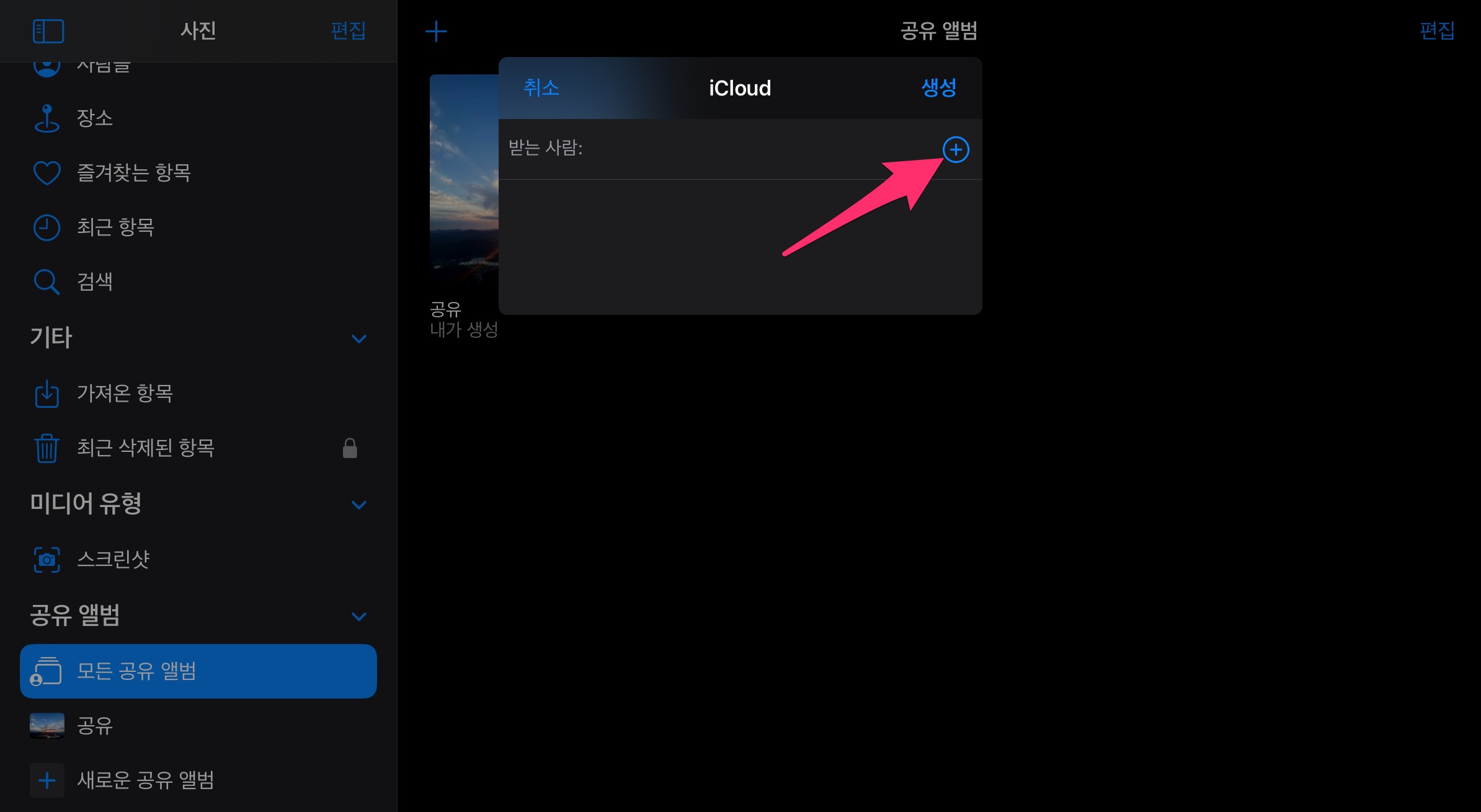 공유 앨범에서 방금 전에 생성한 가족 앨범을 선택하고 + 버튼을 선택합니다.