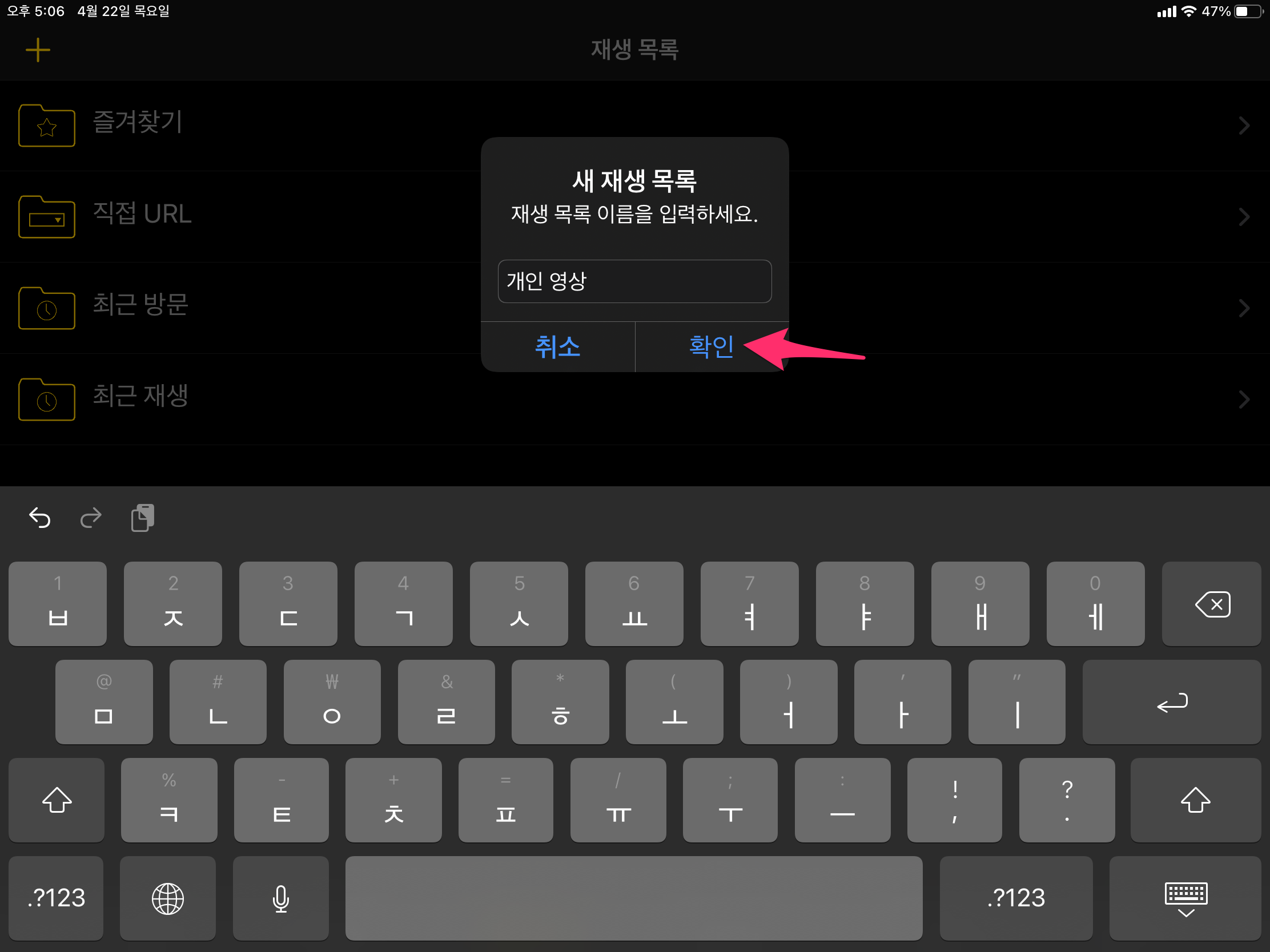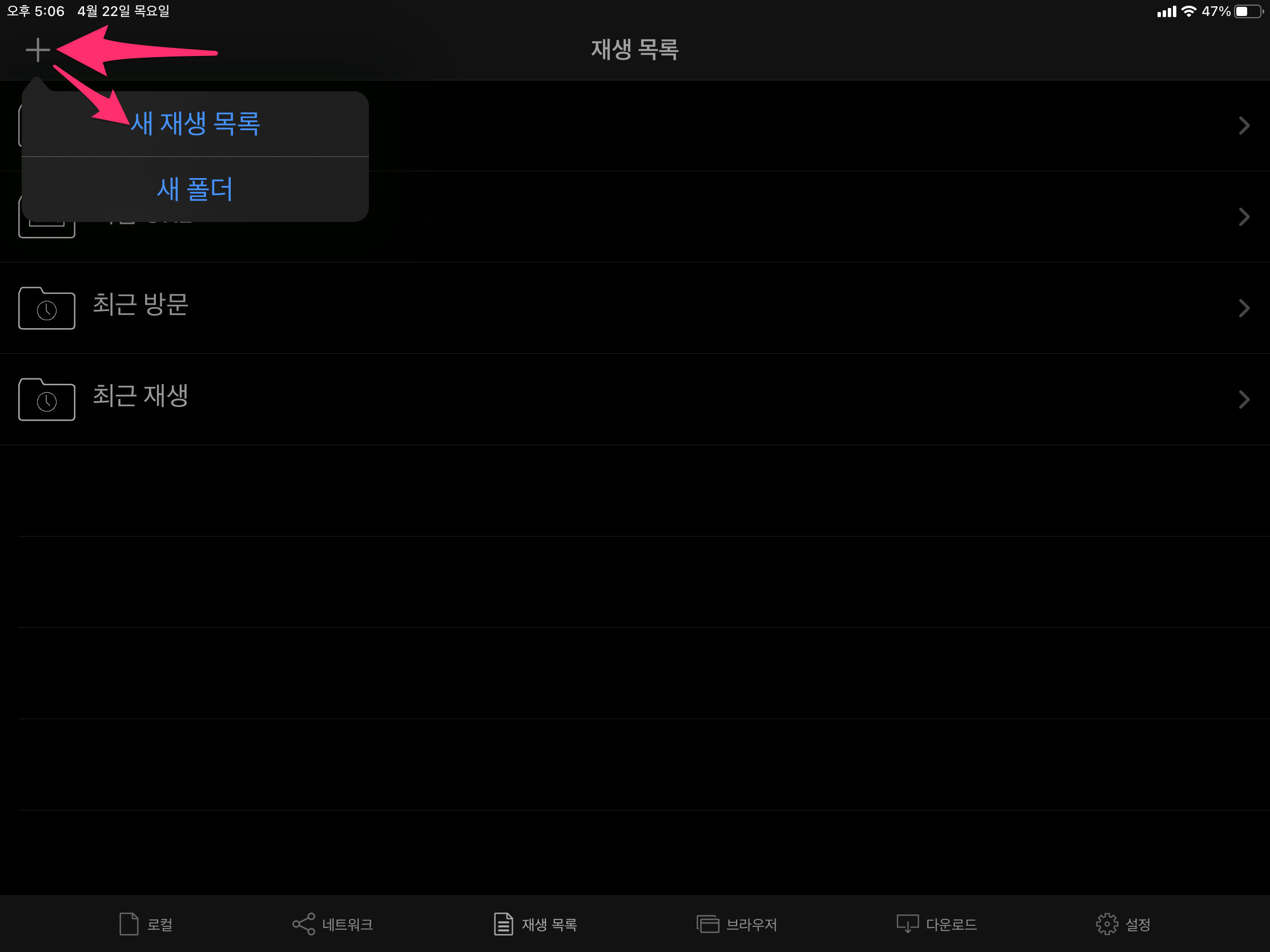 왼쪽 상단에 + 버튼을 누른 후에 새 재생 목록을 선택하고 이름을 입력합니다.