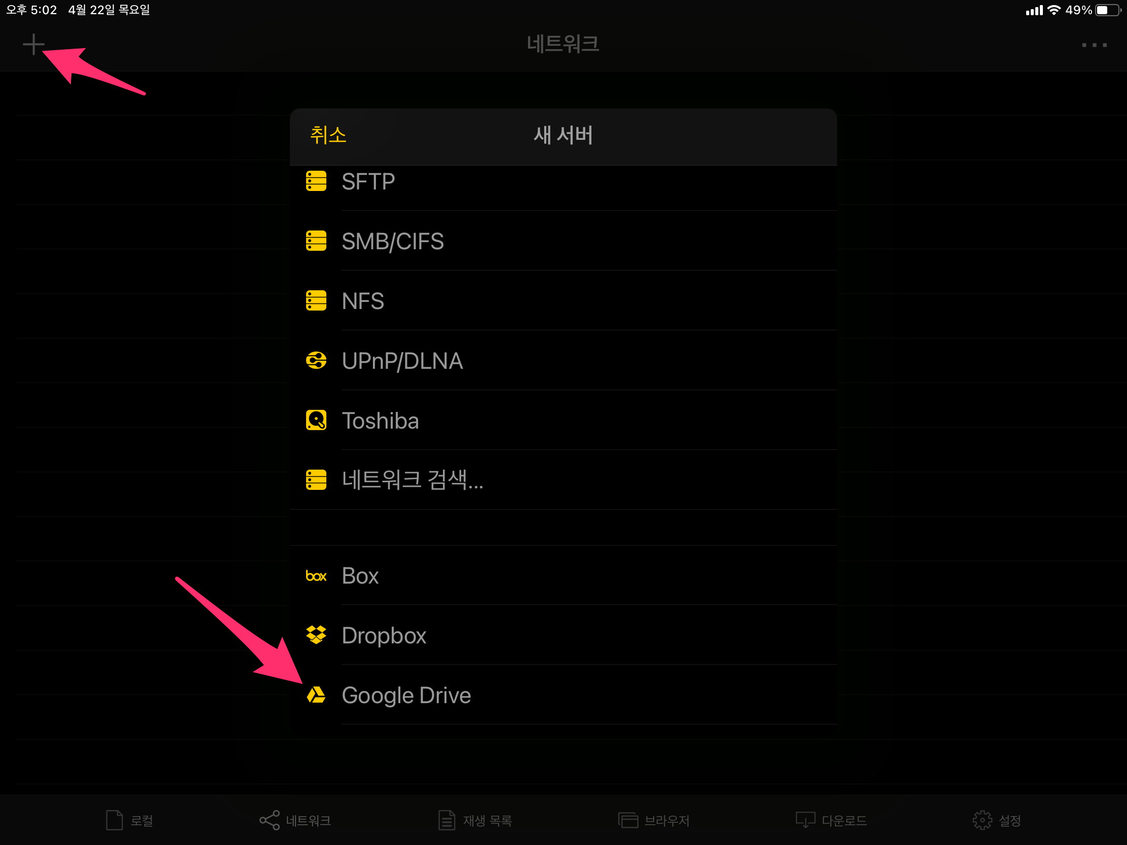 왼쪽 상단에 + 버튼을 선택 후에 새 서버 목록에서 Google Drive를 선택하시면 됩니다.