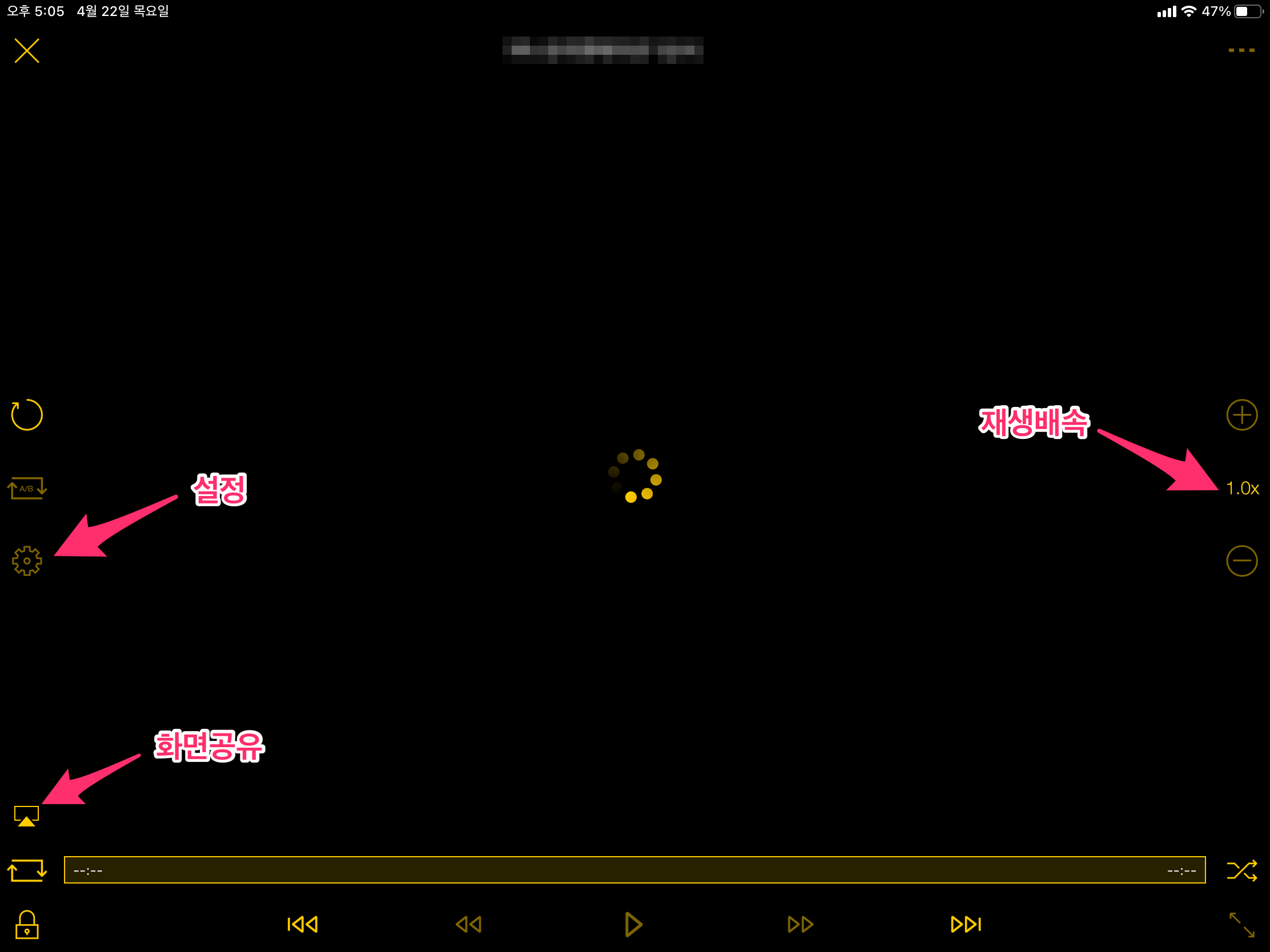 플레이 화면에 다양한 기능(구간반복, 재생 배속 등)들이 있는데요. 한 번씩 확인해 보시면 금방 아실 수 있습니다.