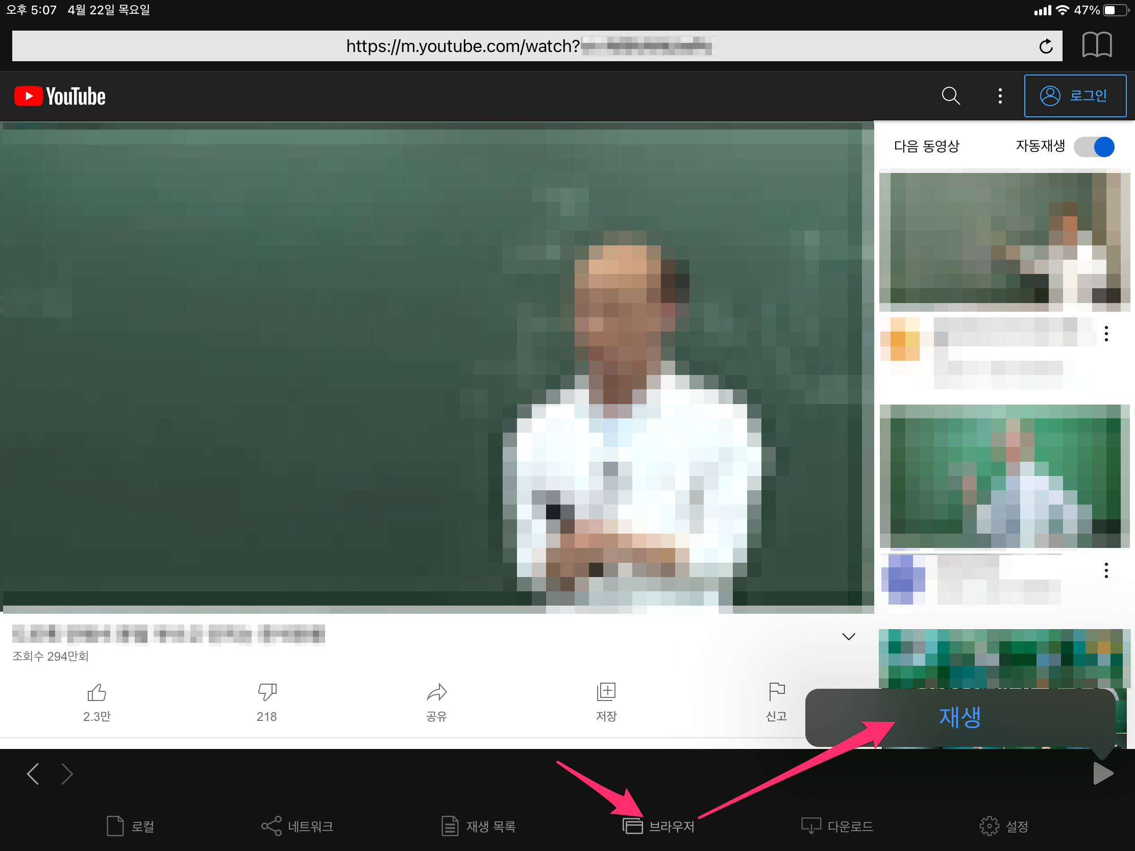 접속한 후에 원하는 동영상 페이지가 나오면 오른쪽 하단에 재생 버튼을 선택합니다.