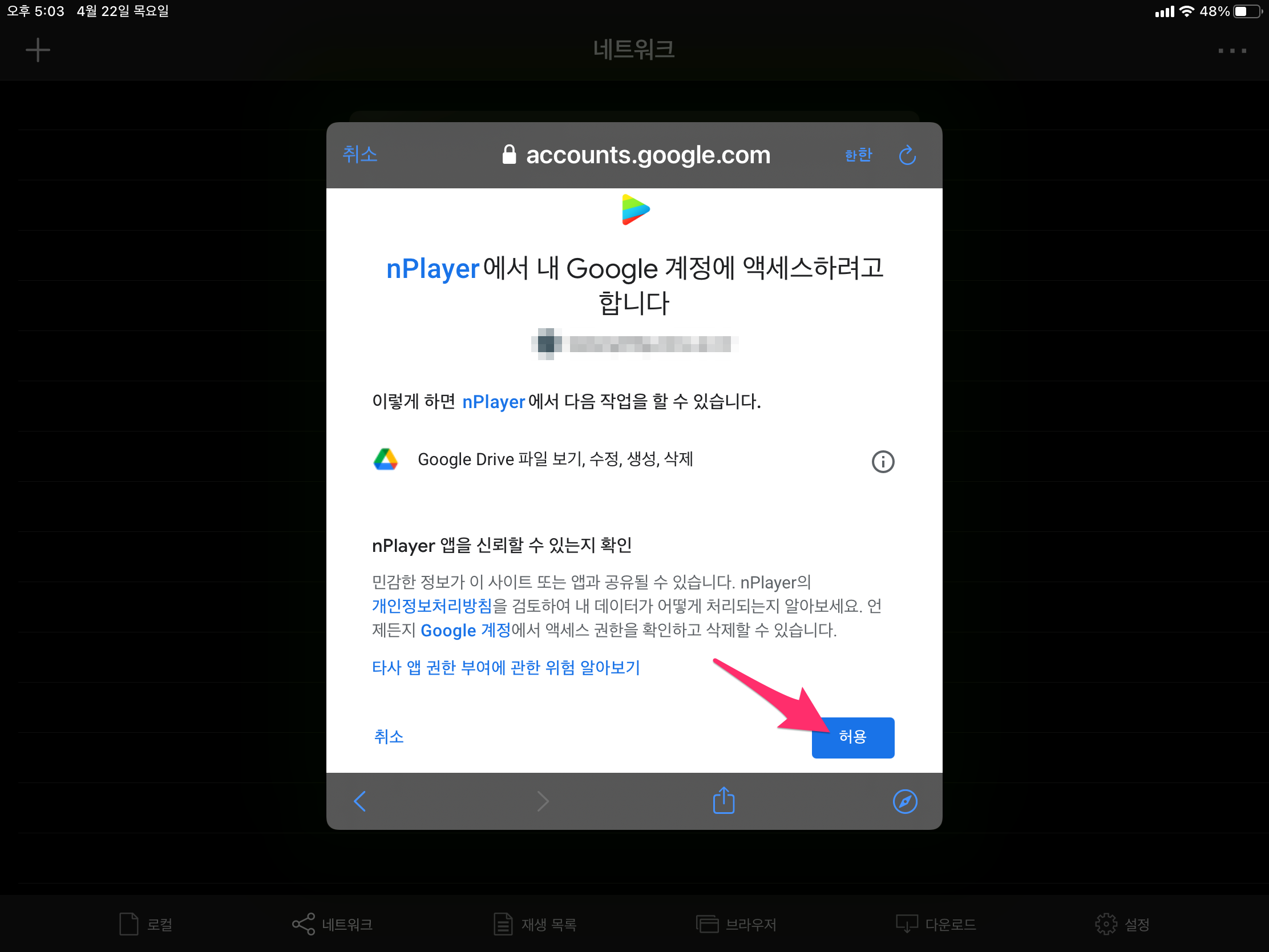 구글 계정 액세스를 허용하신 후에 접속하시면 됩니다.