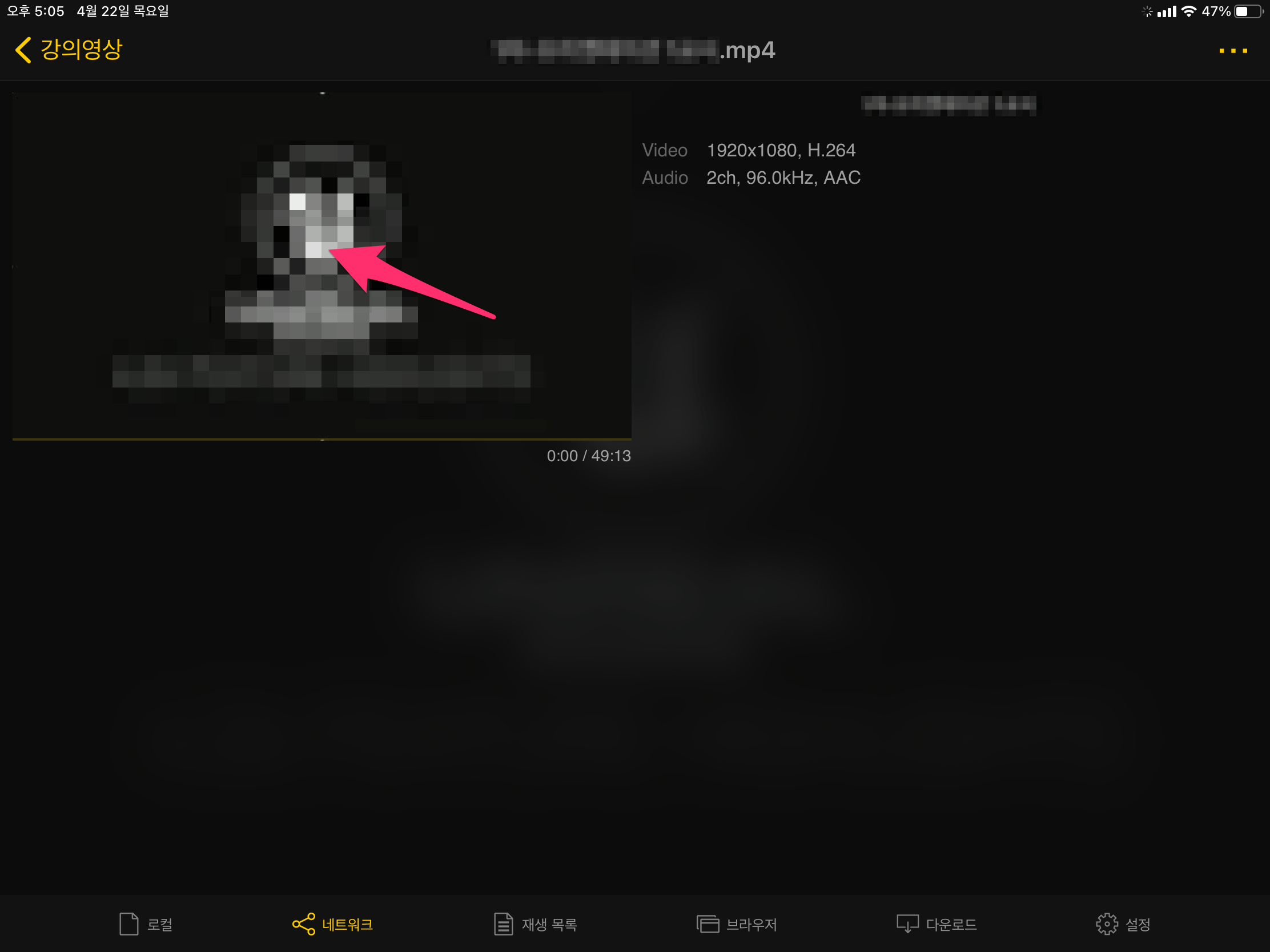 선택한 동영상의 정보가 나옵니다. 동영상 화면 중앙에 있는 플레이 버튼을 선택합니다.