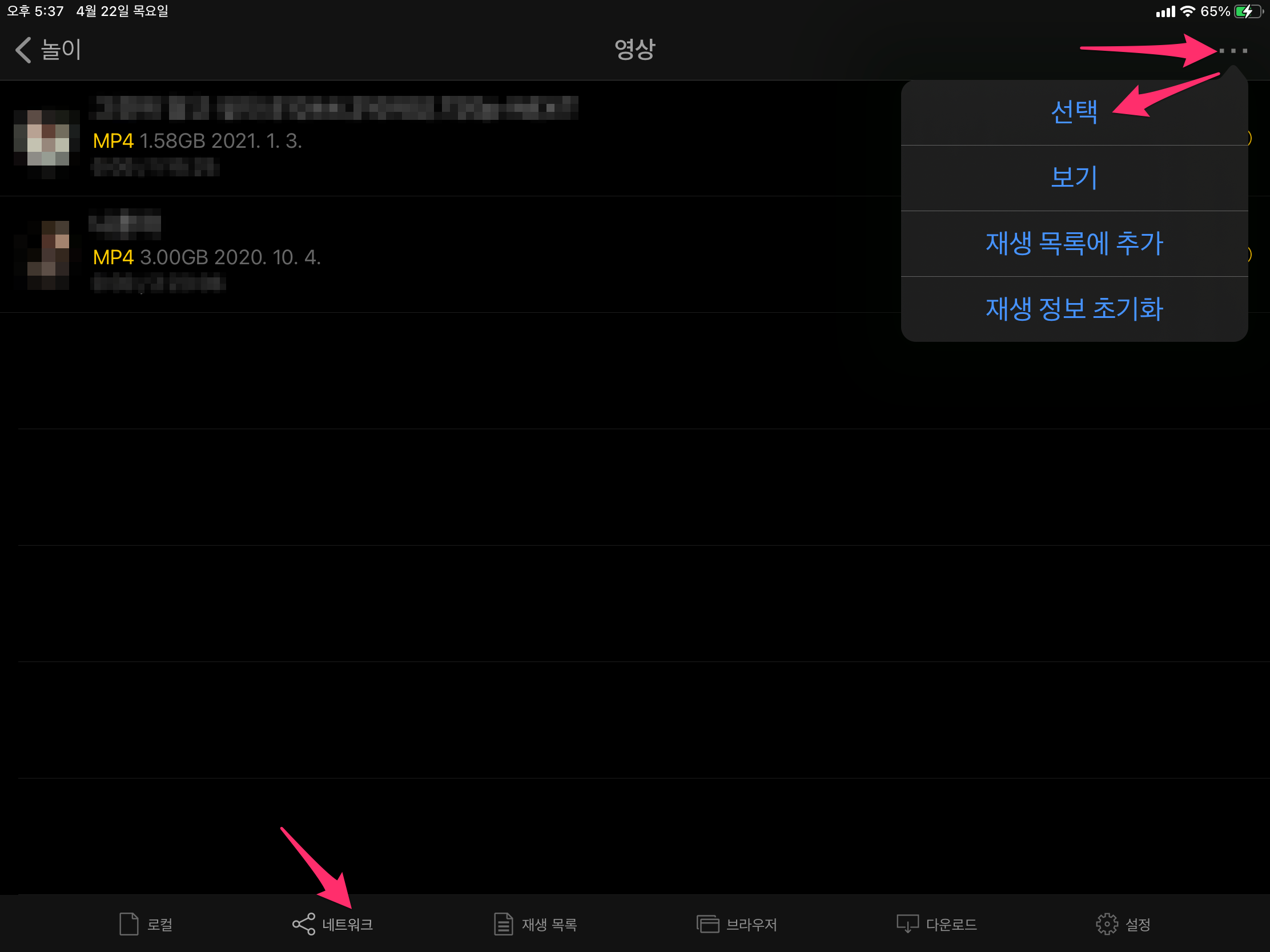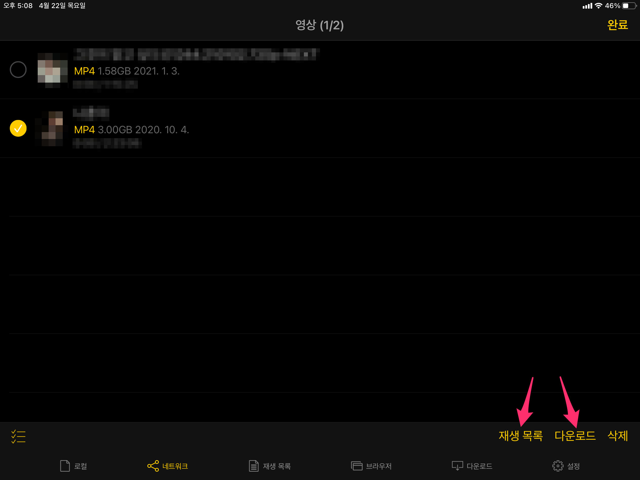 동영상 목록 왼쪽에 선택할 수 있는 원형 체크가 보이고 원하는 동영상을 체크하면 오른쪽 하단에 재생목록, 다운로드, 삭제가 나옵니다.
