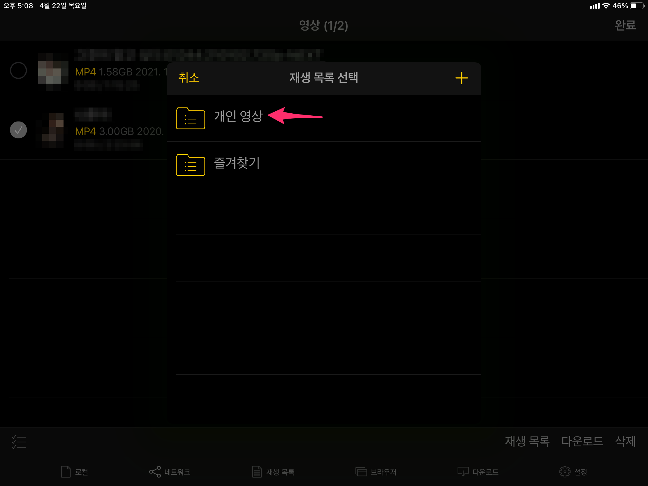 재생 목록이 나오면 아까 제작한 개인 영상 재생 목록을 선택합니다.