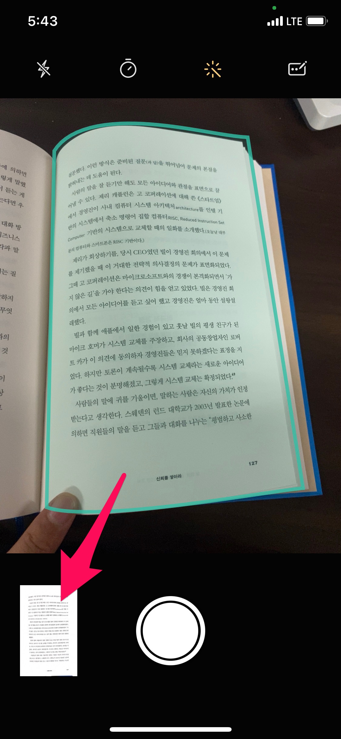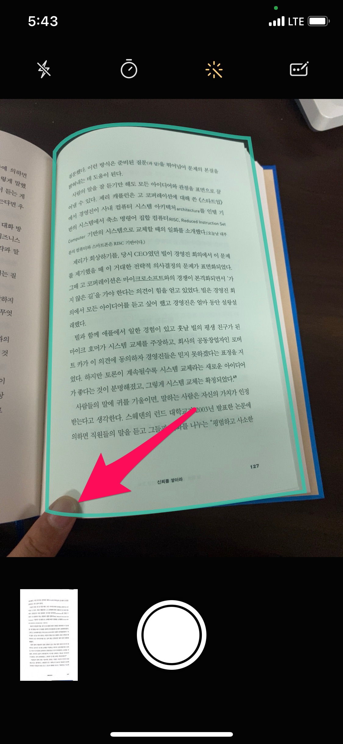 우선 스캔하고 싶은 도서를 펼친 후에 카메라를 갖다 대면 자동으로 페이지 굴곡까지 인식하여 촬영이 가능합니다.