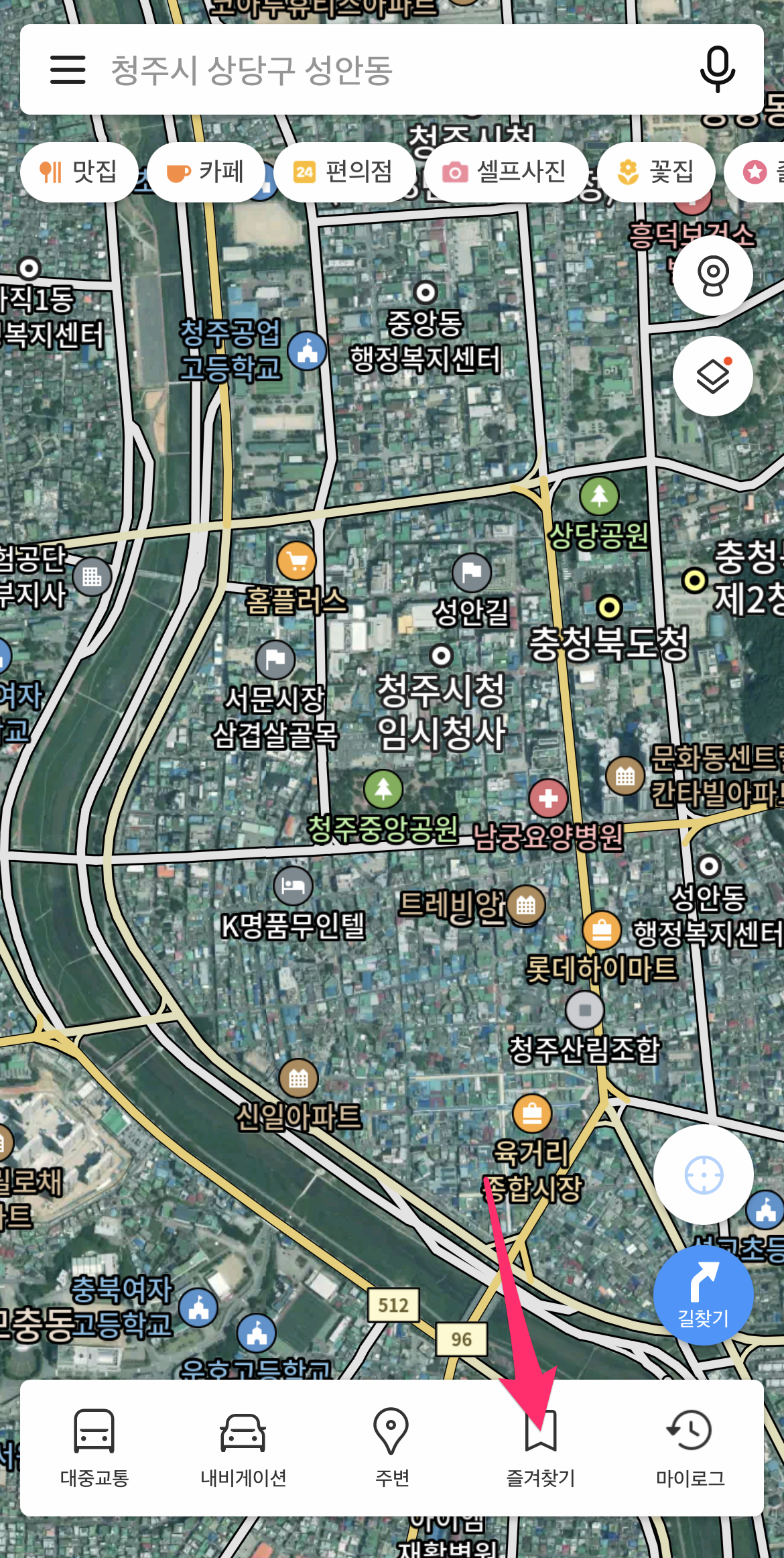 카카오맵을 실행한 후에 하단에 즐겨찾기를 선택합니다.