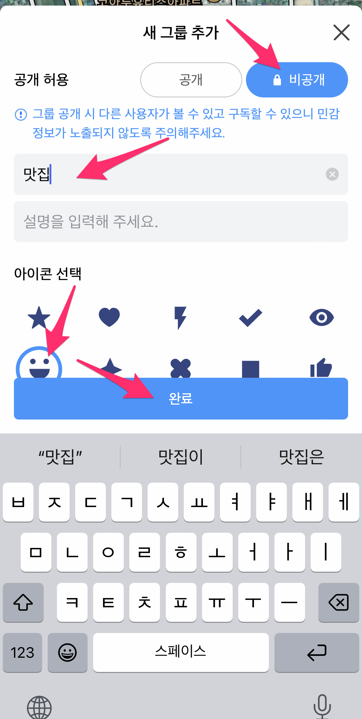 공개 허용은 우선 비공개로 하고 원하시는 이름, 아이콘을 선택합니다.