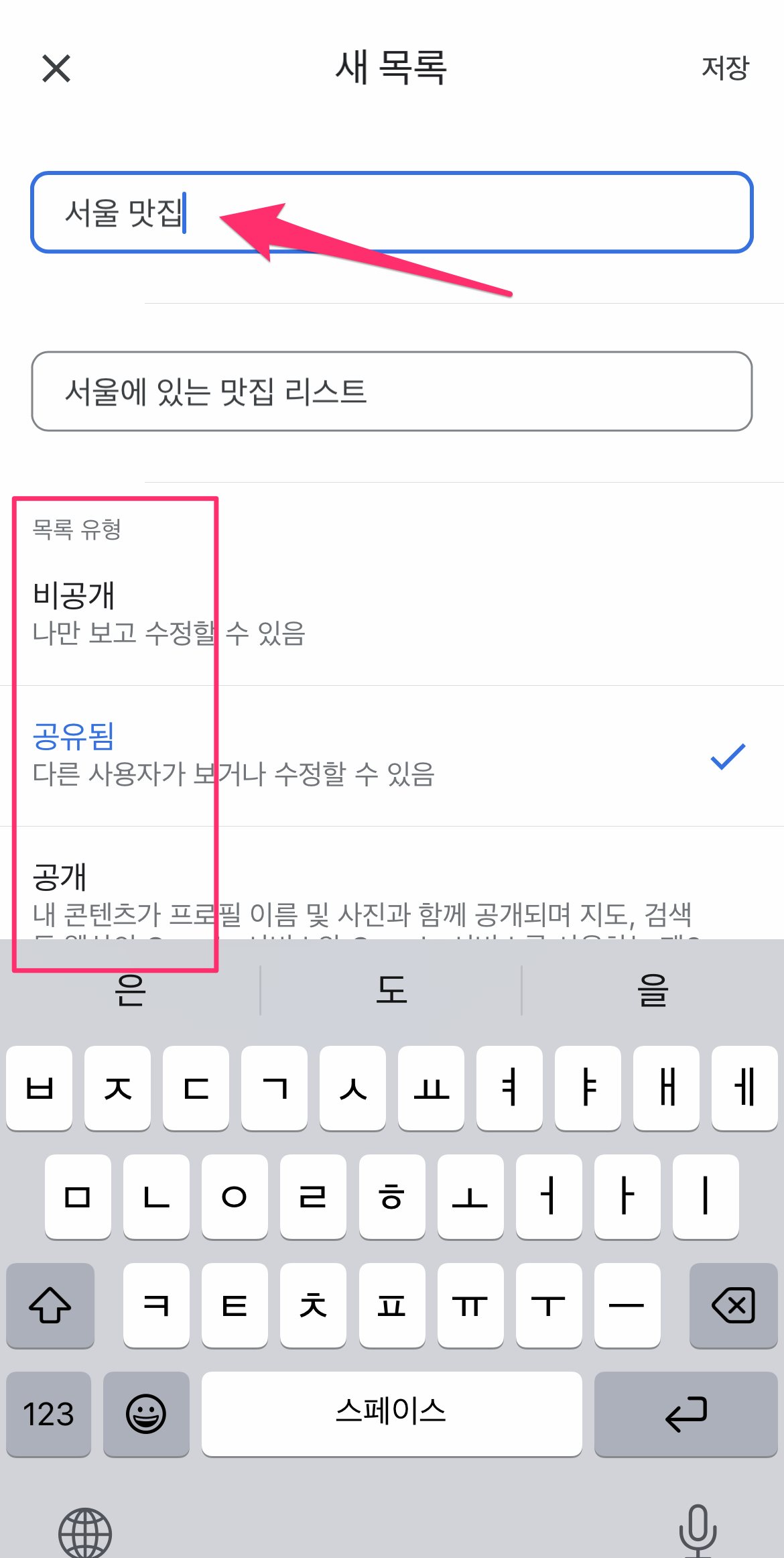 저장되는 목록을 선택하고 완료를 누릅니다.