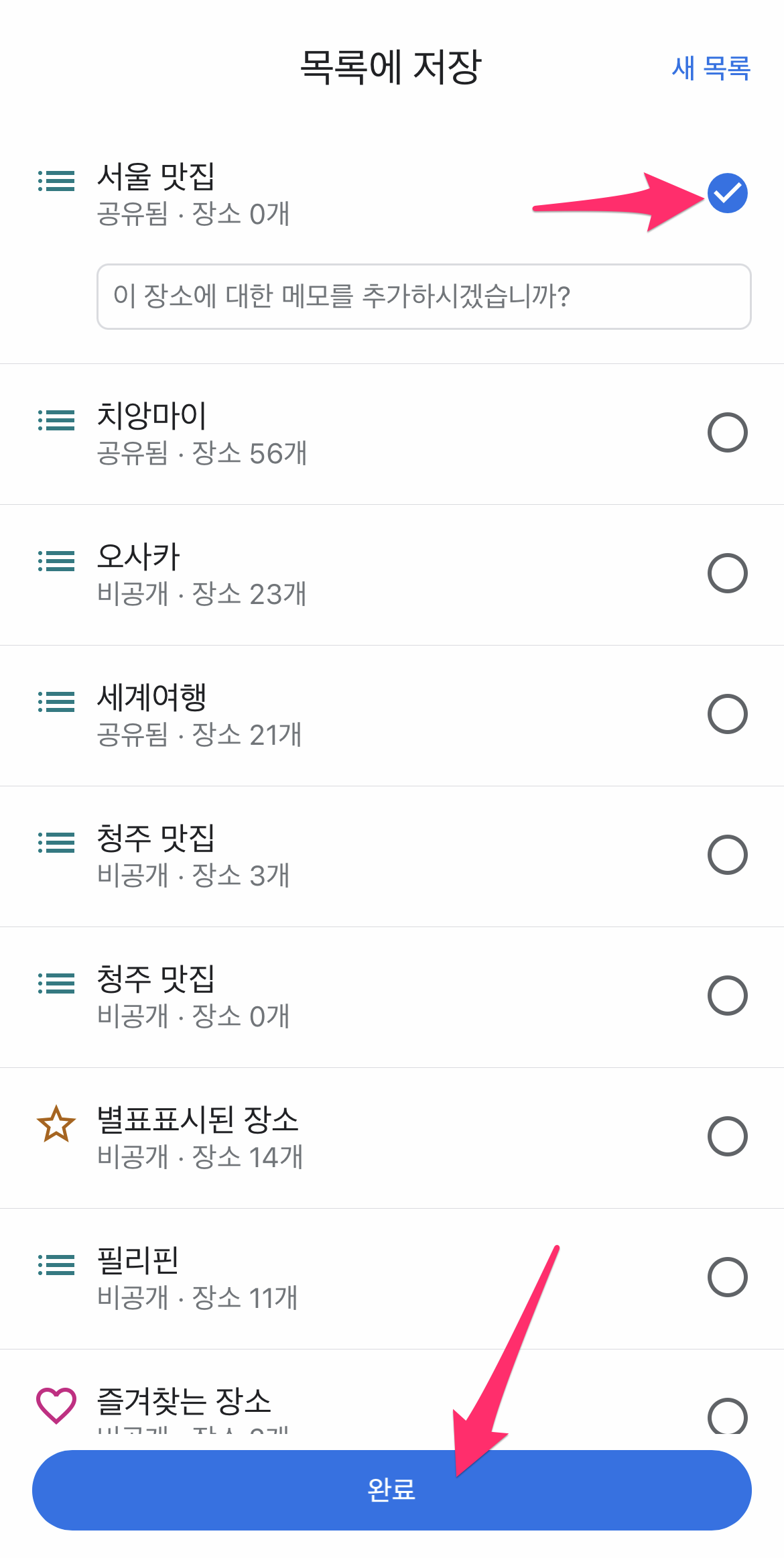 이런 흐름으로 저장하시면 자신이 만든 목록에 장소들이 저장됩니다.