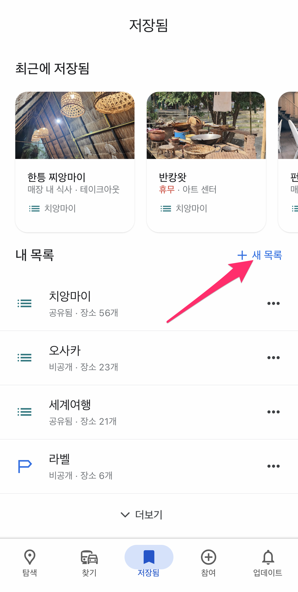다시 하단에 저장됨 을 선택하고 미리 저장된 장소들이 있는 목록을 선택합니다.
