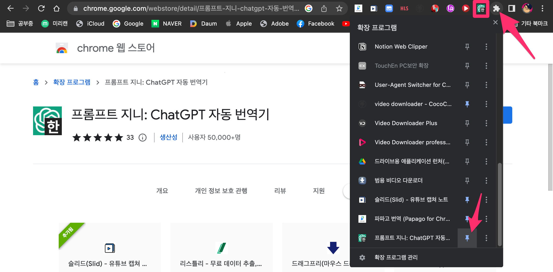 확장 프로그램 옆에 보면 퍼즐 아이콘을 선택한 후에 프롬프트 지니 옆에 핀 아이콘을 선택하여 고정합니다.