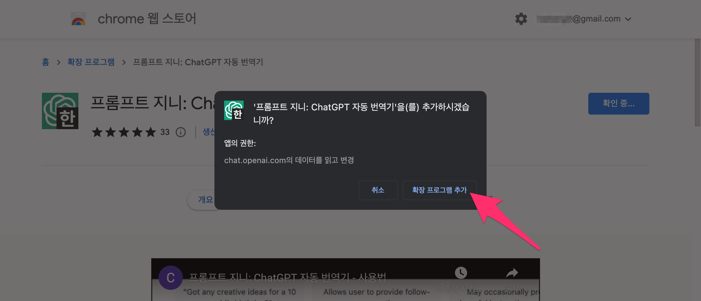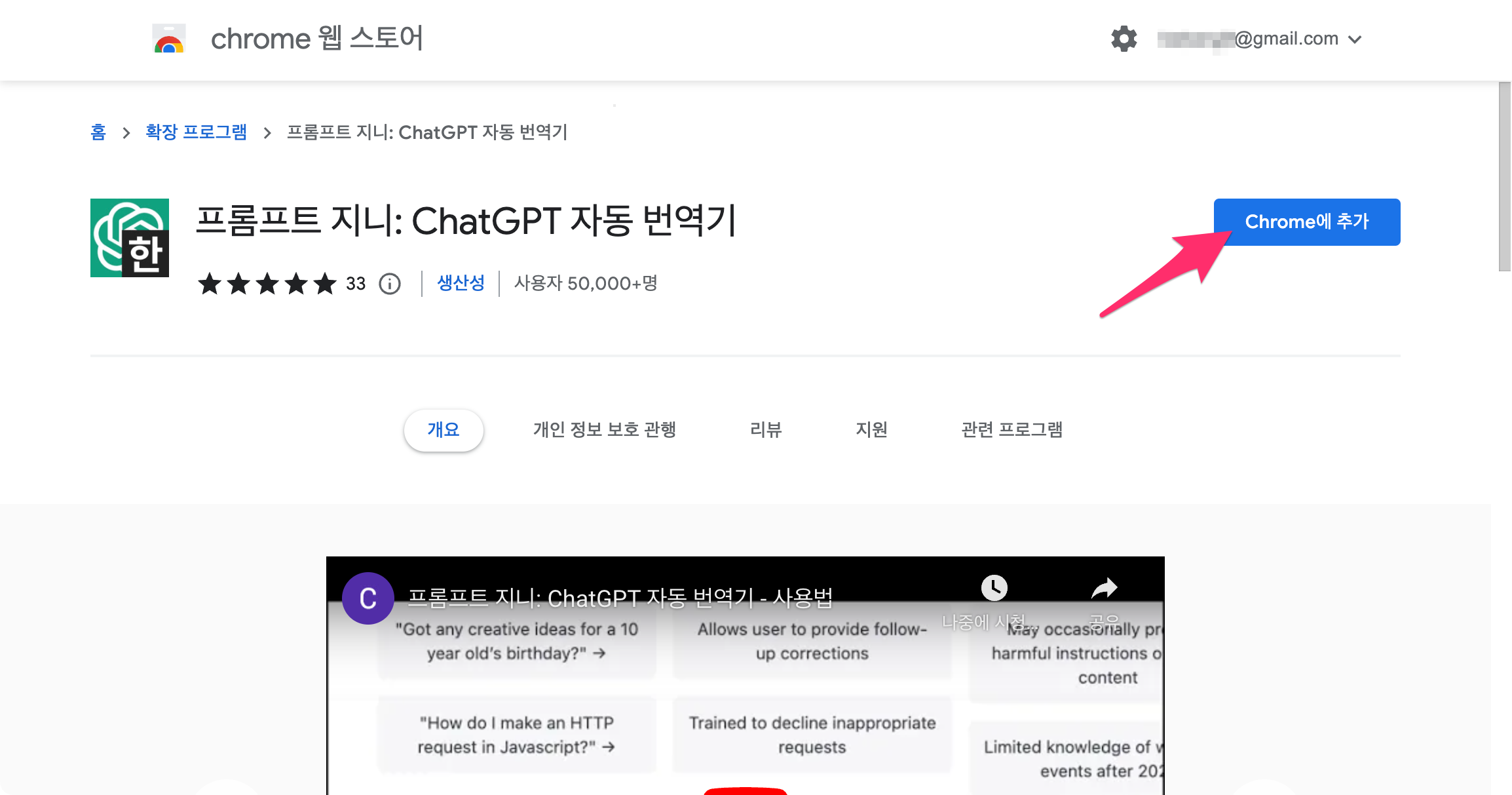 프롬프트 지니 확장 프로그램이 나오면 오른쪽 상단에 Chrome에 추가 버튼을 선택합니다.