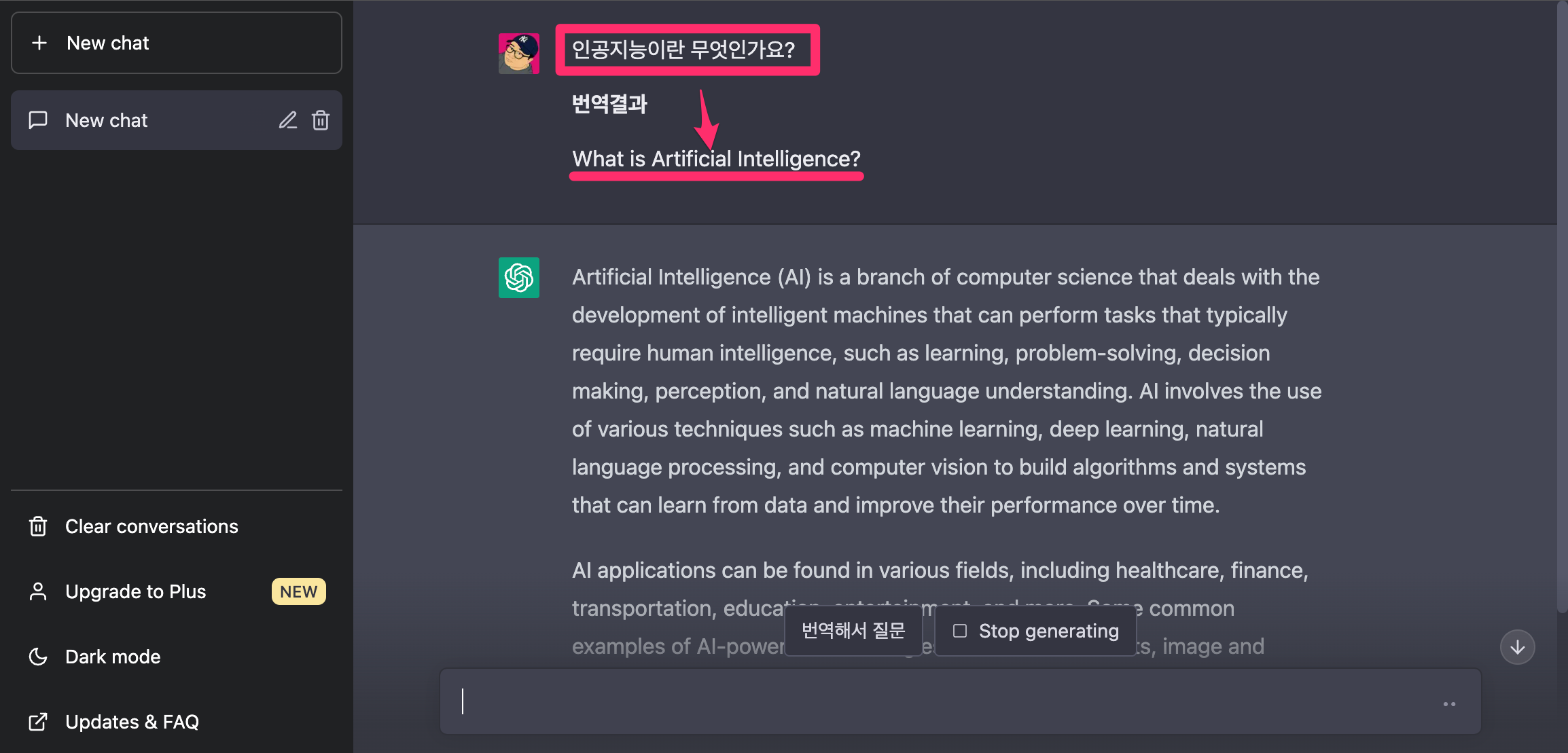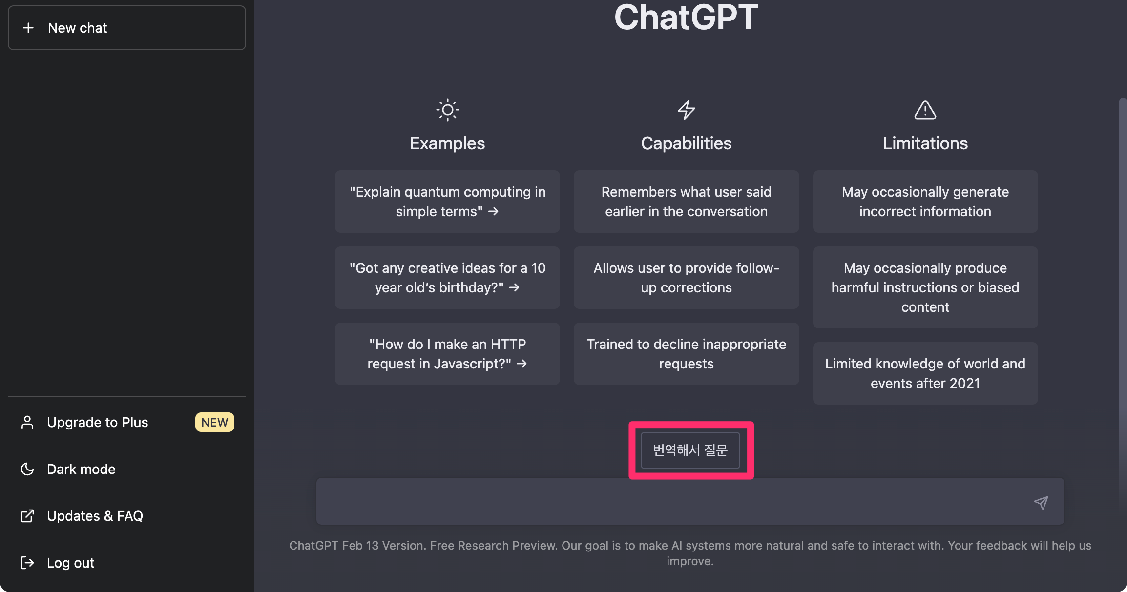 이제 chatGPT 사이트에 접속하면 하단 채팅창 위에 번역해서 질문 버튼이 보입니다.
