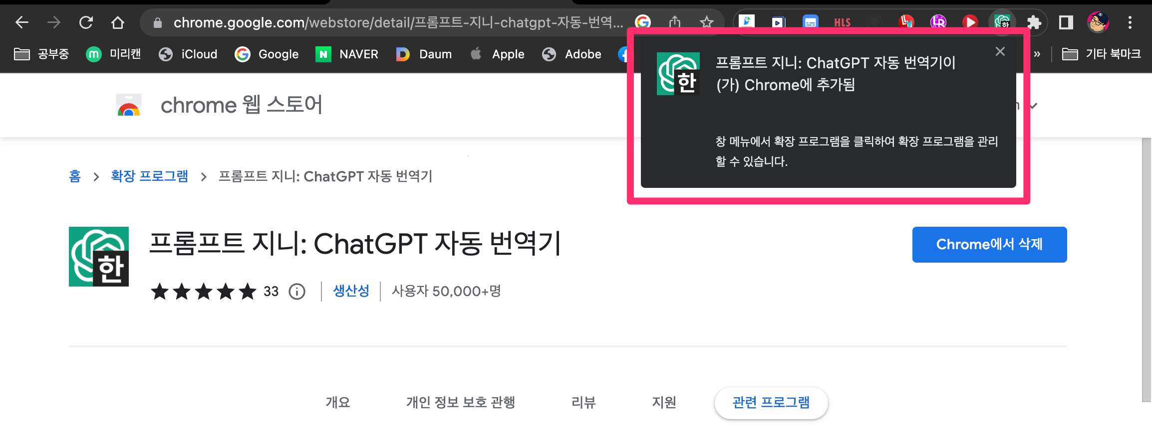 설치가 완료되면 추가되었다고 메시지가 상단에 나옵니다.